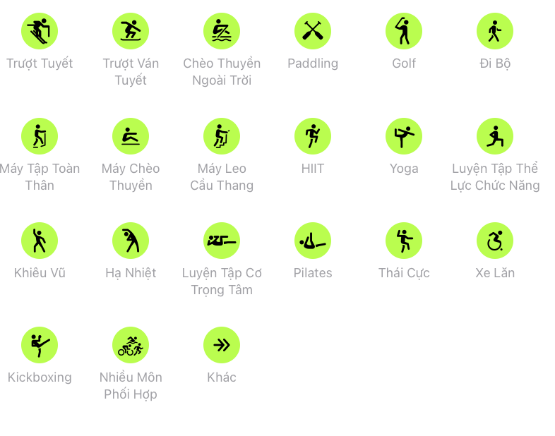 Chạy Bộ Bài tập tùy chỉnh Chế Độ Xem Bài Tập có thể tùy chỉnh Khối Lượng Tập Luyện Vùng Nhịp Tim Đường Đua Tốc Độ Đã Đặt Chiều Dài Sải Chân, Thời Gian Chạm Đất, và Dao Động Dọc Tự động phát hiện đường chạy Bài tập Nhiều Môn Phối Hợp La bàn với phương vị, độ dốc, độ cao, và tọa độ Tọa độ điểm tùy chỉnh Tọa độ điểm do kết nối dữ liệu di động tạo tự động Dữ liệu GPS Quay Về Bản đồ ngoại tuyến với tính năng tạo lộ trình tùy chỉnh Các bản đồ địa hình cho hàng nghìn công viên quốc gia và công viên địa phương (chỉ ở Hoa Kỳ) Hàng trăm tuyến đường đi bộ đường dài được tuyển chọn xuyên suốt 63 công viên quốc gia ở Hoa Kỳ Vận tốc trung bình, độ cao đạt được, và quãng đường Kết nối với các phụ kiện đạp xe qua Bluetooth Ngưỡng Công Suất Hoạt Động Vùng Công Suất Nhịp Hoạt Động Trực Tiếp trên iPhone Bơi trong bể hoặc bơi ngoài trời Bài tập tùy chỉnh cho bơi trong bể Quãng bơi và hiệp bơi tự động Điểm SWOLF Tự động phát hiện kiểu bơi Phát hiện Phao Tập Bơi Tốc độ trung bình, tổng quãng đường, và chặng bơi