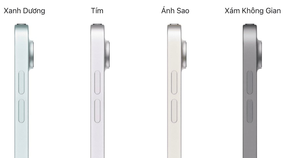 Về màu sắc, iPad Air M4 có 4 lựa chọn thời trang: Xanh dương (Blue), Tím (Purple), Ánh sao (Starlight), Xám (Space Gray)